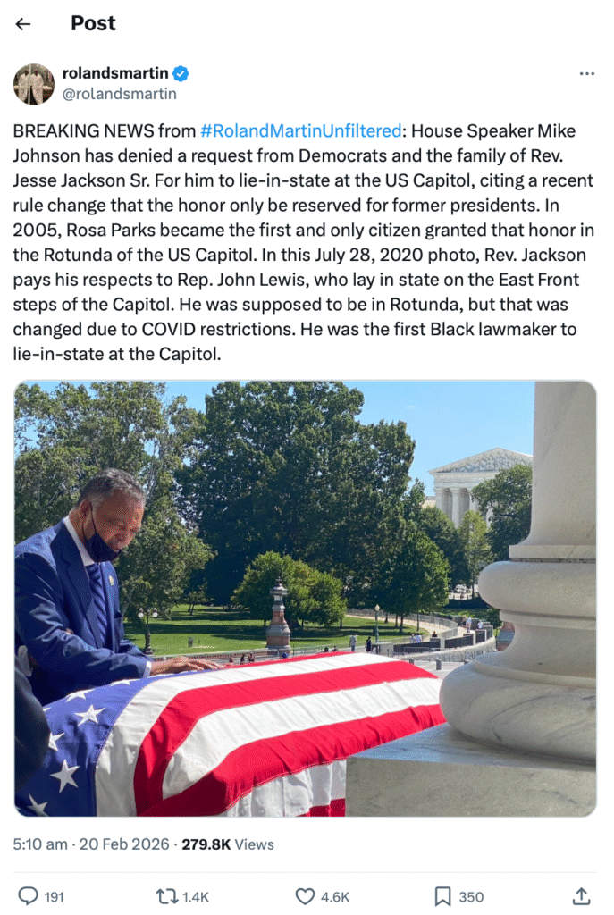 Public reporting confirms that House leadership declined the request for Jackson to lie in state, citing internal procedural standards. The decision has drawn comparisons to past honorees such as Rosa Parks and John Lewis, both of whom were granted that distinction.